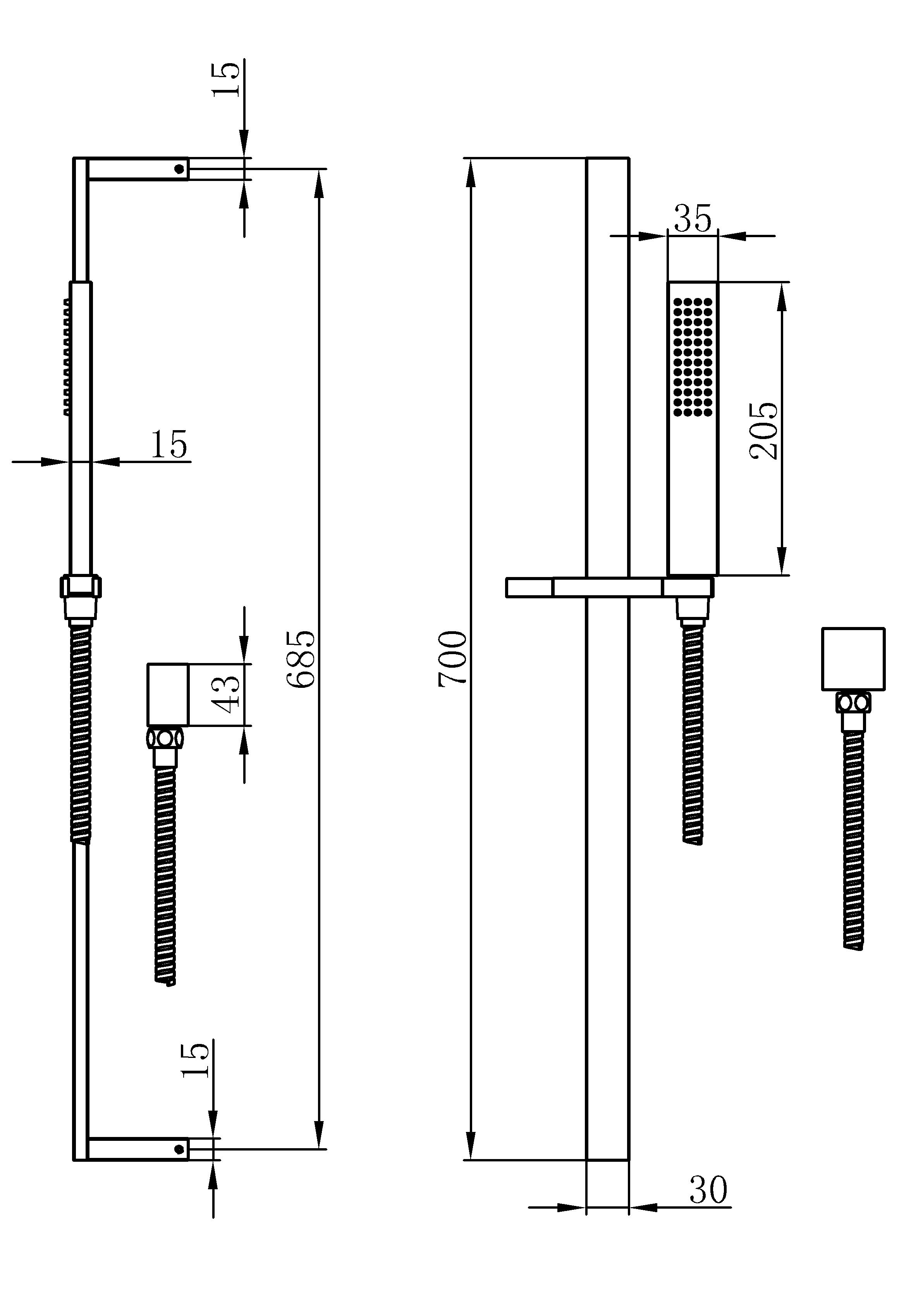 MAIN MATERIAL : Brass shower column, brass hand shower, 1.5m ss hose, brass slider, brass shower elbow